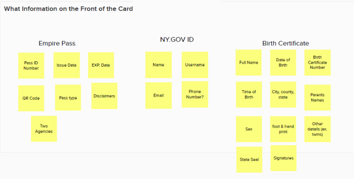 The type of information shown on the credentials varied based on the agency and project associated with it. Based on information gained from stakeholder meetings, requirement documentation, and physical versions of credentials, data points were listed and organized within a Mural whiteboard. We specifically looked into what information absolutely had to be included on the credentials and where it was best to display it, “front of card” or “back of card”.